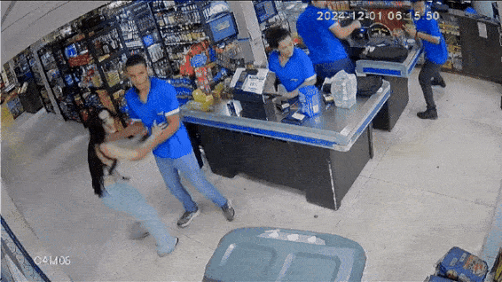 Então, às 6h04, um funcionário levou uma máquina de passar cartão para Sâmia fazer o pagamento das bebidas, mas ela bateu na mão dele e derrubou o equipamento. Ele pegou a máquina e ela continuou na grade. Sâmia ainda bateu no rosto dele e derrubou o óculos usado pelo funcionário.