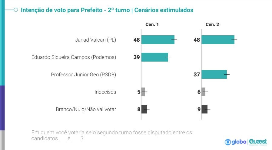 A Quaest também pesquisou dois cenários de um eventual segundo turno na disputa em Palmas. Janad Valcari (PL) ganharia de Eduardo Siqueira Campos (Podemos) e de do professor Junior Geo (PSDB). Veja: