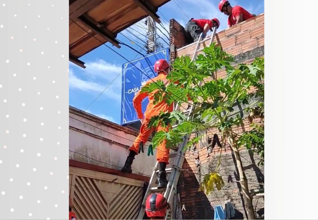 Quando os bombeiros chegaram ao local, viram a vítima deitada com a barriga para cima e consciente, ainda em cima do telhado. Foi preciso usar equipamentos e uma maca para conseguir descer o homem do local.